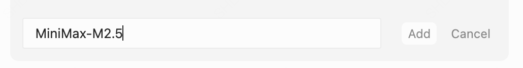 - Enter the model name “MiniMax-M2.5”, then click the “Add” button.