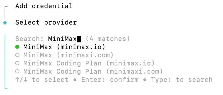 api.minimax.io; for users in China, selectapi.minimaxi.com) - In MiniMax API Key, enter the API key from the MiniMax Developer Platform (For users in China, visit MiniMax Developer Platform).