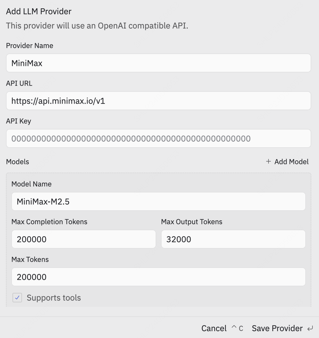- Under API Provider, select “MiniMax”.